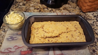 In separate medimum bowl combine milk, eggs, vanilla and sweet potato. Beat with a whisk until combined. Pour the wet ingredients into dry and add the melted butter and combine until all mixed well together. I add in about 1 / 2 a cup of finely chopped pecans. Batter will be thick.